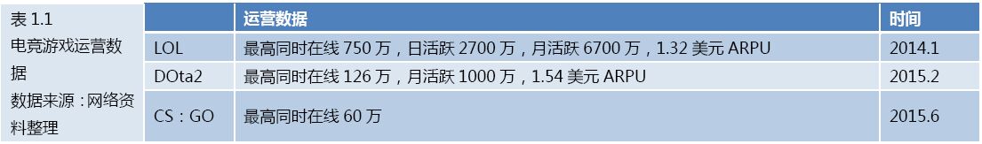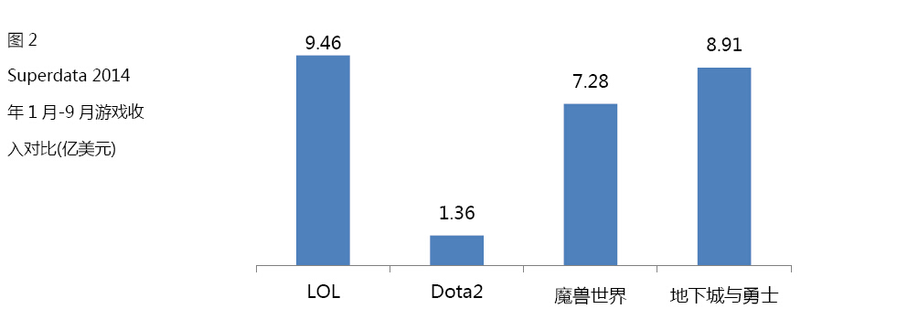 电子竞技游戏因其收入模式的不同,ARPU 相较于一般游戏低很多,根据 Superdata 2013 年的调研显示,LOL ARPU 仅 1.32 美元, Dota2 ARPU 为 1.54 美元。消耗时间多,金钱花费少,极具互动性的特点使得 MOBA 游戏一时风靡。而凭借庞大的用户基数, MOBA 类游戏依然获得可观的收入。同样来自 Superdata 的数据显示,2014 年 1-9 月, Dota2 全球收入 1.36 亿美元(有很大一部分归功于 Ti4 期间的收入,在赛事部分提及), LOL 全球收入 9.46 亿美元。