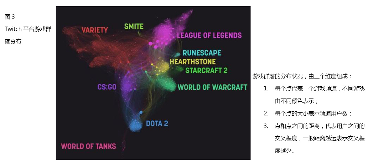 上图为 Twitch 于 2014 年 12 月公布的平台游戏群落分布,按照游戏类型不同进行分类: