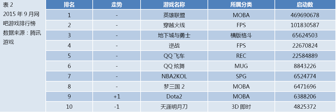 根据 Steam、Riot 的数据, LOL 月活跃 6700 万,国服占比 47%, Dota2 月活跃 1000 万,国服占比 7 %。下表为 2015 年 9 月网吧游戏排行榜,如表中所示,在国内 MOBA 类游戏中,梦三国的玩家甚至要高于 Dota2 ,而从目前各直播网站提供的内容来看,梦三国的占比几可以忽略不计(主要在小平台如 KK 直播进行直播),并不是每一款游戏都有直播价值,即使同是 MOBA 。