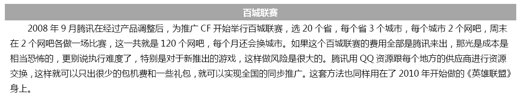 也即核心——扩散——赛事——媒体——核心扩大……的路线,随着厂商的介入,手段越发成熟,过程越来越短。腾讯的 CF 和 LOL 在推广中均采用了百城联赛的模式,同时在全国多个城市开始发力,让游戏一夜之间火及全国。电竞赛事在中间起到了及其重要的作用。
