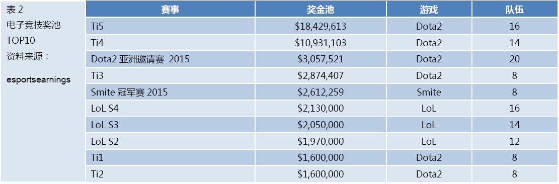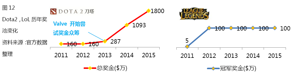 电竞赛事中奖金最高的都是 Dota2 开发商 “ Valve ” 或者运营商 “完美世界” 举办的官方赛事。这样的奖池规模归功于 Valve 采用的类似于众筹的比较新颖的奖金筹集模式。而 LOL 赛事奖金则全由官方出资,2012 年以来冠军奖金一直保持 100 万美元的规模。