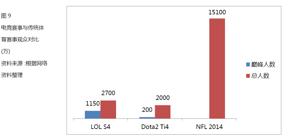 2014年《Dota2 国际邀请赛》决赛网络直播巅峰在线观众 200 万,S4 更是达到 1150 万,赛事的规模及覆盖的观众已经不容忽视。但是相较于主流体育赛事仍然有较大的差距。报告显示 NFL (美式橄榄球) 全球观众数达 1.51 亿,另根据美国媒体 SMW (SPORTS MEDIA WATCH) 报道,2014 超级碗当天电视观众达 1.12 亿 (网络直播观众仅数十万),NBA2014年 最后一场决赛仅美国电视观众就达 1800 万。