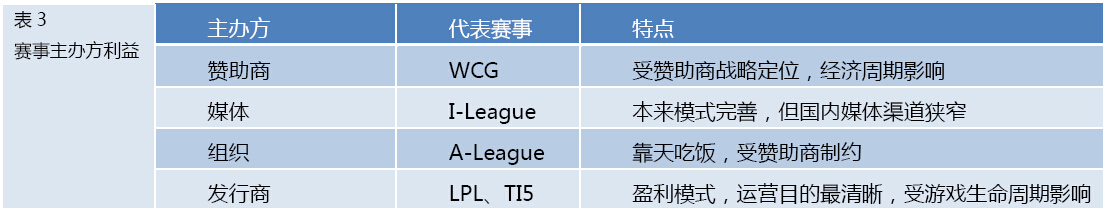 开发商赛事和媒体赛事将成赛事主导;开发商赛事有明确的扩大游戏用户群,促进玩家付费的运营目的,也是受关注度最高的赛事。媒体则拥有自己长期建立的影响力,拥有稳定的播出渠道,离商业赞助和消费者都近。硬件厂商赛事看厂商心情;第三方组织赛事无法盈利。