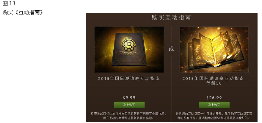 2011 年 和 2012 年两届 TI 赛事,Valve 出资 160 万美金打造的 “ Dota2 国际邀请赛”,已经成为当时全球奖池规模最高的电竞赛事。从 2013 年开始,Valve 在 “ Dota2 国际邀请赛 “开赛前三个月推出了赛事《互动指南》,售价 10 美金,俗称小金(绿,紫)本。在官方提供 160 万美金的奖池基础上,《互动指南》25%的销售收入($2.5)也将进入赛事总奖金池。