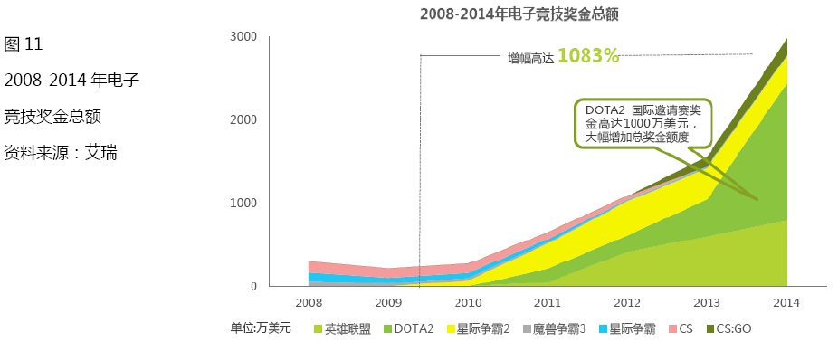 2010 年,Valve 在年底推出了由 Dota 地图原作者 “冰蛙” 担纲的 Dota2,借着原作超高的人气,东家 Valve 的鼎立支持,2011 年还在封测阶段的 Dota 举办了国际邀请赛,总奖池达到 160 万美金,冠军奖金 100 万美金,一举成为单项赛事奖金最高的电竞赛事,而同年英雄联盟全球总决赛的奖金池才仅 10 万美金,冠军奖金 5 万美金。可以说 Dota2 TI 赛事的奖金池直接拉高了全球电竞赛事的奖金水平,英雄联盟自 S1 以后也将冠军奖金提高到了 100 万美金。