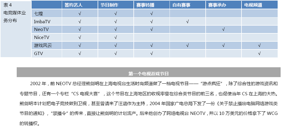 电子竞技在国内一直没有完善的商业模式。2010 年开始,先从游戏解说开始有一定的收入,捧红了一票解说的同时,越来越多的公司投入到电竞媒体产业中,其中有成立 10 年以上的老牌电视媒体,也有新近成立的内容生产平台。下表列出比较知名的几个视频媒体的业务分布,基本上围绕艺人解说进行内容生产。现状下容易出现平台主播的影响力往往超过媒体本身。