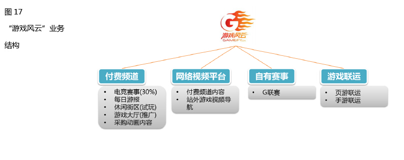 2007 年,游戏风云开始举办自有赛事 G 联赛,首届赛事引入了 War3,SC,CS 三个项目,与 PLU 平台共同转播,游戏项目随着时间不断更替,但赛事本身则一直延续至今。对标韩国电视台 OGN,电视频道的自有赛事拥有稳定的收益能力,而在国内受到传播渠道的限制,赛事价值也受影响,但据 2012 年 Sintv 称,G 联赛每年能为游戏风云带来上千万元的商业赞助。而随着直播平台的成长,玩家观看游戏直播习惯的养成,赛事价值有很大空间。