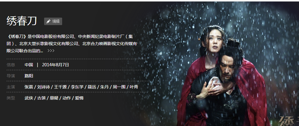 《绣春刀》是中国电影股份有限公司、中央新闻纪录电影制片厂(集团)、北京大楚长歌影视文化有限公司、北京合力映画影视文化传媒有限公司联合出品的浪漫武侠电影,由路阳执导,张震、刘诗诗、王千源、李东学、聂远、金士杰等主演。