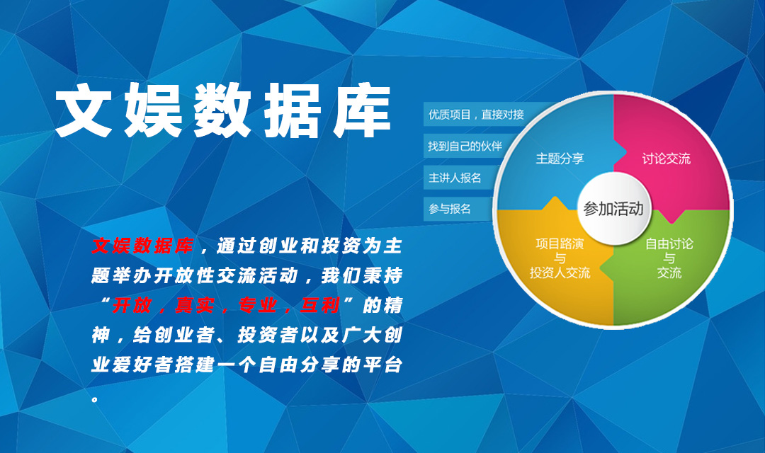 文娱数据库,是一个开放的以创业和投资为主题的交流活动,我们秉持“开放,真实,专业,互利”的精神,给创业者、投资者以及广大创业爱好者搭建一个自由分享的平台。