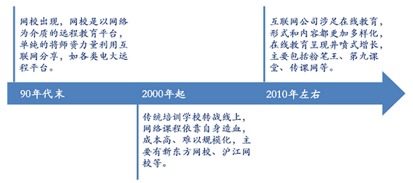 从发展历程来看,我国在线教育经历了从远程教育平台、培训机构转战线上、到目前的互联网公司涉足在线教育三个阶段。在这一发展过程中,在线教育的形式和内容越来越多样化,便利程度也不断提高,越来越多的消费者开始乐意尝试这种新型学习形式。