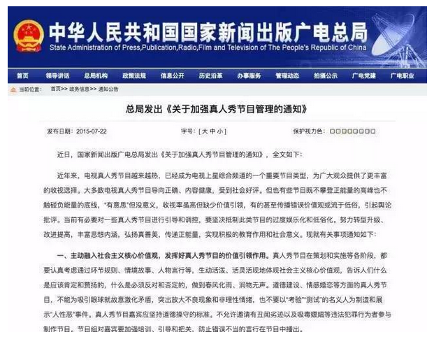 2015年7月22日,国家新闻出版广电总局发出 《关于加强真人秀节目管理的通知》(民间简称“限真令”,以下简称《通知》)。《通知》指出,真人秀节目已成为上星综合频道的一个重要节目类型,部分节目“有意思”但没意义,收视率虽高但缺少价值引领,有的甚至传播错误价值观或流于低俗。有必要对一些真人秀节目进行引导和调控,丰富思想内涵,传递正能量。