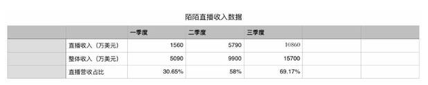 财报显示,三季度陌陌直播业务产生营收1.086亿美元,在整体收入中占比为69.17%,直播已经成为当之无愧的收入之王。由于陌陌直播业务在一年前才推出,还无法做同比分析,但环比增长却十分可观。直播业务在今年一季度首次被单独拎出来统计,收入为1560万美元收入,在整体营收占比为30.65%;二季度直播贡献了5790万美元收入,在整体营收中占比超过58%,这个季度陌陌直播又翻了近一倍(环比增长87.6%),势头很猛。当直播收入占比已接近70%之时,我们完全可以认为陌陌已经不再是一家基于LBS的位置社交公司,而是一家基于LBS的视频社交平台。