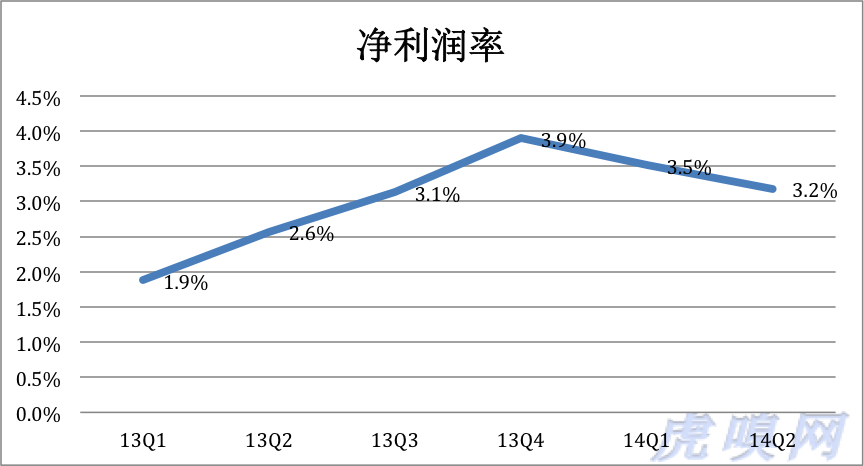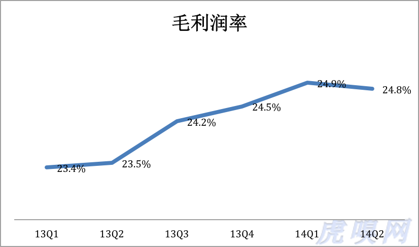 2014年二季度毛利润为24.8%,去年同期23.5%,只上升了1.3个百分点。说明乐蜂营收占比不大。