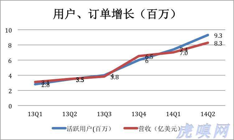唯品会业绩增长的驱动力是活跃用户数增加。除了常规营销,上市并且成为中国概念第一高价股使唯品会的品牌形象得到很大提升。2013年一季度活跃用户人数为280万,今年二季度达到930万。从下图看到,营收与用户两条线绞在了一起。