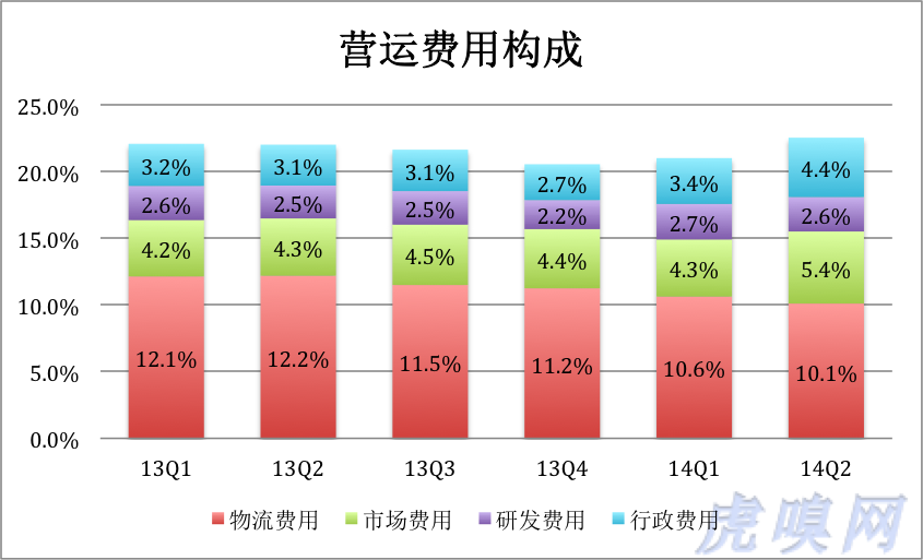 唯品会营运费用中的大头是履约费用(物流是它的子集)。由于管理水平提高及规模效益,履约费用占营收的比值从2013年二季度的12.2%降至今年的10.1%,平均每客单约为20元(去年同期为24元)。