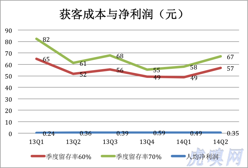 唯品会没有公司活跃用户的季度留存率(即本季度活跃用户中下季度仍然活跃的比例),按60%、70%两个留存率,参照各期市场费用,推算出最近六个季度的获客成本。
