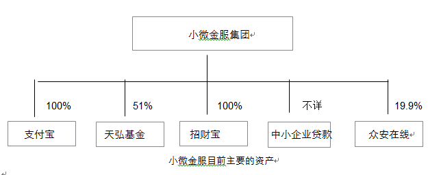 小微金服目前的主要资产包括了支付宝、招财宝、中小企业贷款业务、天弘基金(占股51%)、众安在线(占股19.9%)等。