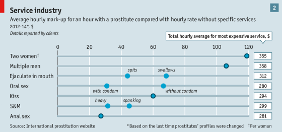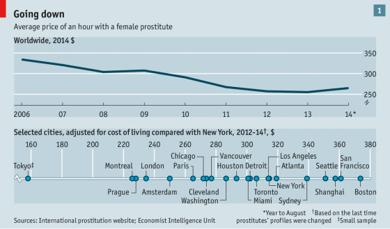 网上的海量数据,使得外界得以对性交易市场中那些规模更大,但却不太为外人所知的部分进行分析:换言之,就是那些关起门来做生意的卖淫活动。但令人意外的是,色情行业却与其他服务领域有着惊人的相似:妓女的个人特征和她们提供的服务,都会对价格产生直接影响;小众服务要价更高;互联网也可以方便她们更加灵活地工作,并砍掉中间环节。
