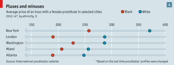 由于数据太少,因此无法按照种族因素对其他城市进行分类统计。但美利坚大学的克里斯蒂安·钦(Christine Chin)曾经对一些国家的高端跨国妓女进行过研究。她发现,在吉隆坡,黑人妓女的要价很高。而在新加坡,价格较高的则是越南妓女。在迪拜,欧洲妓女价格最高。不同地区对于“异国风情”和“令人满意”的定义各有不同,这要取决于人口流动等很多因素。