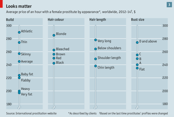 漂白后的头发算不上真正的金发,因而溢价水平较低,但仍比其他颜色的头发更有“销路”。如果本身的身材不够火爆,那么从经济角度来看,隆胸手术是值得的:从平胸变成D杯罩后,每小时的嫖资大约增长40美元。按照3700美元的常规隆胸手术价格计算,大约只要90小时便可收回成本。