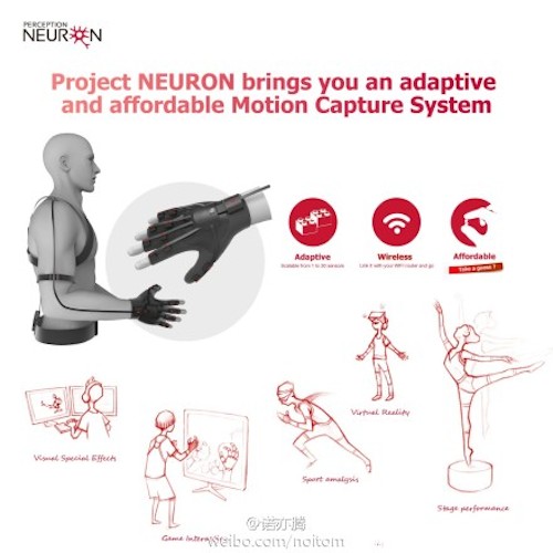 产品介绍:其实把诺亦腾推出的Project Neuron放在这里显得有些不太合适——人家本来就是一家研究动作捕捉技术的公司,只不过其被大众熟识,可能更多源于其为CCTV"我爱世界杯”和CNTV”超级世界杯”制作的虚拟球员——那些虚拟球员会配合嘉宾的话语做出相应动作,诺亦腾在动作捕捉方面已经具备国际竞争力。Project Neuron 是诺亦腾最近准备推出的项目属于开发套件,相比于其10-15万的高端体感动作捕捉仪器(这还是在其完成数百万美元A轮融资后从30万降下来的),这个衍生品的目的更像是依靠低价(据透露可能就3位数)来让动作捕捉被更多的行业所采纳。根据CTO戴若犁所说“主要应用领域是虚拟现实、游戏交互、体育医疗、特效后期、动画制作等”。产品将于8月12在Kickstarter上呈现。
