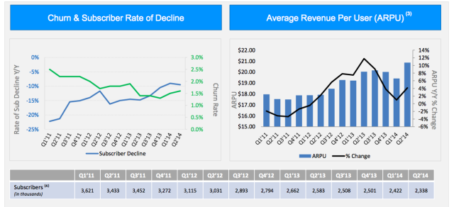 他们是怎么做到的呢?很简单。拨号上网是一项淘汰了的技术,使用人数会越来越少,于是美国在线就不断提高单个用户支付的价格:2011 年是 300 万用户,每月 18 美元。今年刚刚过去的这个季度则是 234 万用户,每人每月 20 美元。