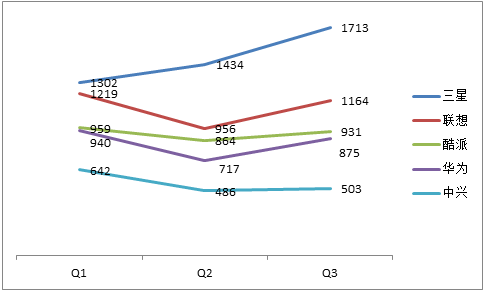 每年的第二季度,是产品销售淡季。手机厂商很头疼,有尾货需要清理,有新品开始上市,是否有良好的渠道关系,能否合理的向渠道压货,决定着销售业绩情况。先看下2013年前三个季度中国智能机销量TOP5情况,通过数据进行分析(数据来源:易观国际,单位:万部)。