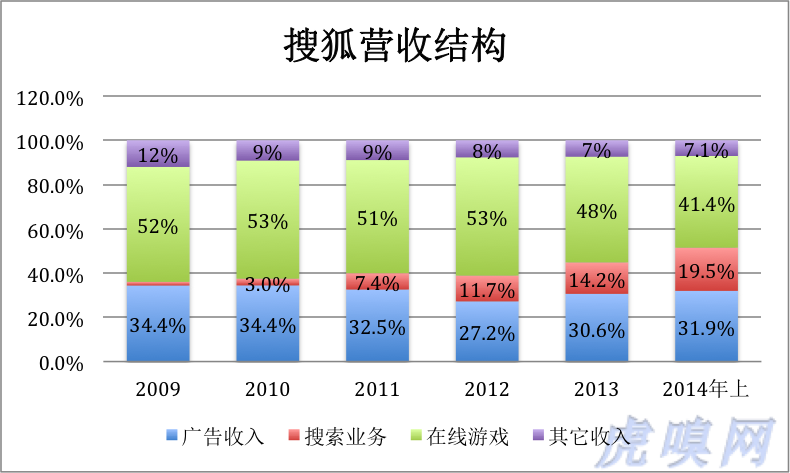 畅游早已上市,搜狗控制权即将旁落腾讯,严格来讲,搜狐从这两家所获收益属于“投资收益”而不是营业收益。2012年、2013年及2014上半年,搜狐营收中的“投资收益”保持在60%以上,已然是“半个投资公司”了。
