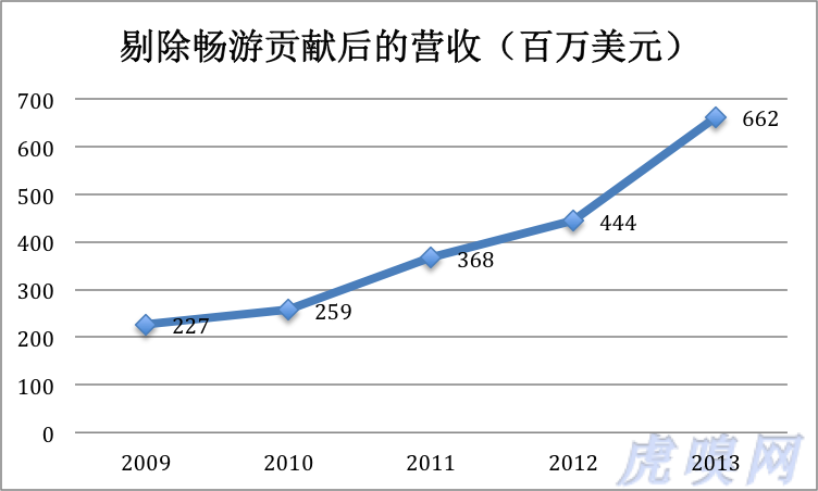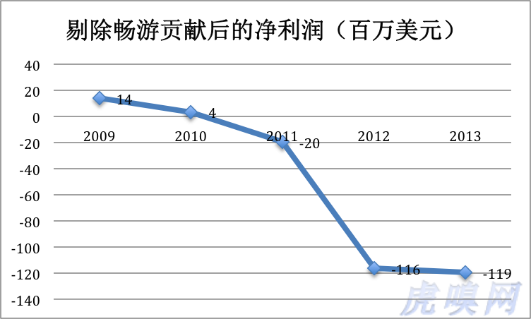 但净利润却惨不忍睹!原来,不计畅游,搜狐2010年就只有400万美元净利润,2012年、2013年都亏损了将近1.2亿美元!(注:搜狐的并表方式是将畅游的游戏收入在Online game项下100%并入)