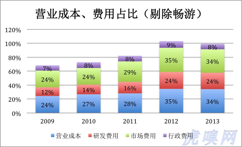 剔除畅游之后,搜狐业务主要包括三部分:门户、搜索和视频。参照新浪、百度和优酷土豆的数据,搜狐门户、搜索的毛利润率应在70%左右,而视频业务只有30%左右。三块业务混在一起,营业成本占营收的34%,毛利润率66%,不算低了。