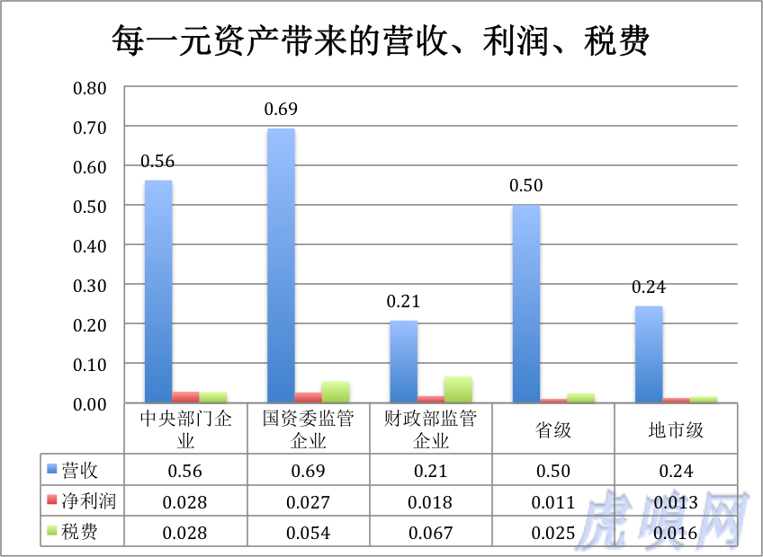 占用104万亿资产,仅仅产生47万亿营收,1.9万亿利润,上交税费3.8万亿。在其它方面表现神勇的财政部管企业,资金使用效益却惊人之低:每占用一块钱只带来0.21元营收和不到2分钱的利润!