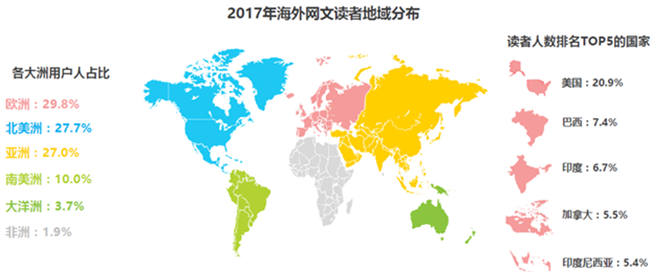 从最开始的火爆东南亚,到日韩地区及后来的美国、英国、法国、俄罗斯、土耳其等欧美多地,中国网络文学的足迹已经遍布20多个国家和地区,其影响力也在不断的发展和壮大。海外网文读者在地域分布上以欧美地区和亚洲地区为主;人数占比最高的前五名国家分别为,美国:20.9%,巴西:7.4%,印度:6.7%,加拿大:5.5%和印度尼西亚:5.4%。