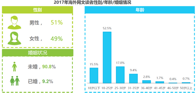 根据同类产品调研结果显示,性别方面,男女差距不大,但目前中大部分参与者的市场定位集中于男性用户,针对女性的网文翻译网站较少;婚姻方面,网文读者未婚人群显著高于已婚人群;而在读者年龄方面,30岁以下的读者覆盖了85.0%。这表明海外市场目前也正处于市场起步阶段。