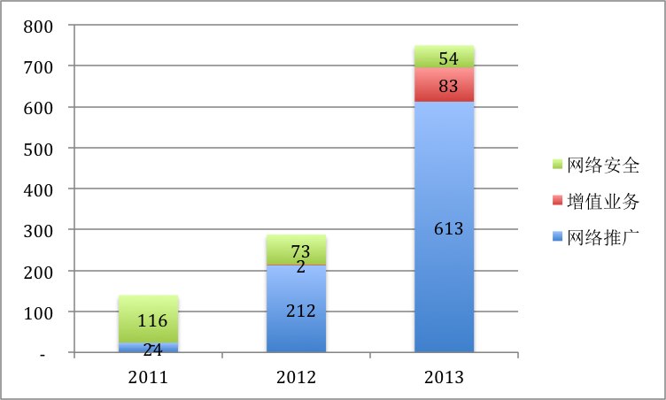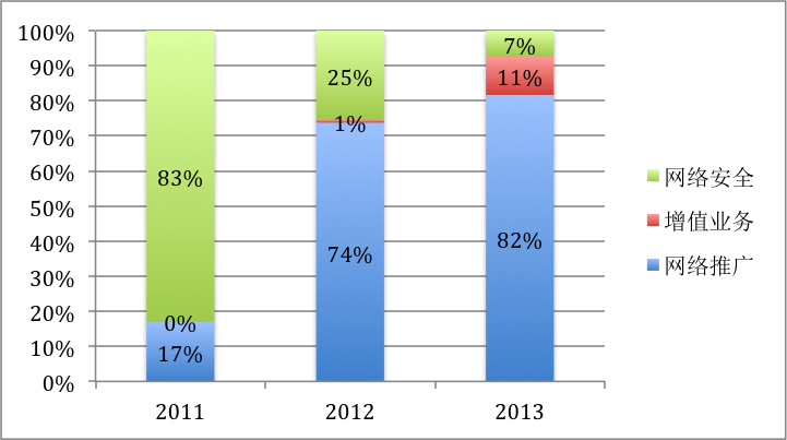 2011年,其支柱业务“网络安全”,占营收的82.9%。而2012年迅速跌至25.4%,到2013年只占7.2%。而网络推广业务却是异军突起,2011年只占营收的17%,2013年增至83%。