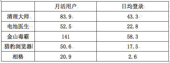 算上PC和移动的总数,毒霸的月活用户是1.41亿;猎豹浏览器的月活是5060万。