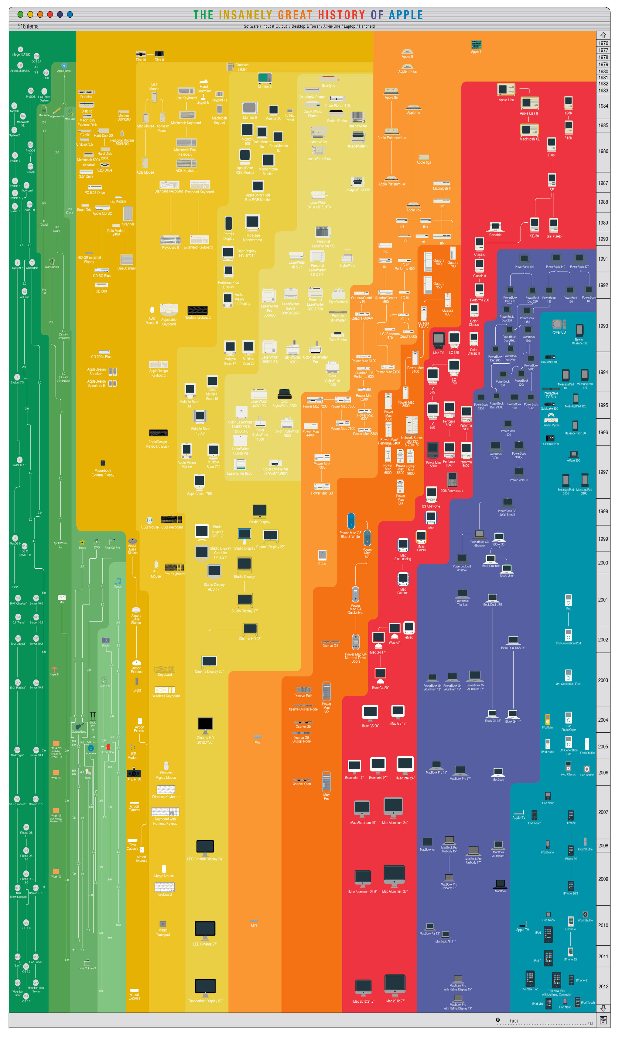 Pop Chart Lab 推出了2012年全新的苹果产品全系列海报纪年表,使用颜色将不同系列的产品分类,纵向以纪年方式呈现,包含了从1976年苹果的Apple I 电脑,到现在2012年的最新iPad mini等等。其实Pop Chart Lab还出售69 x 99cm(27 x 39")的真实海报,售价32美元,有兴趣的朋友可以了解一下: