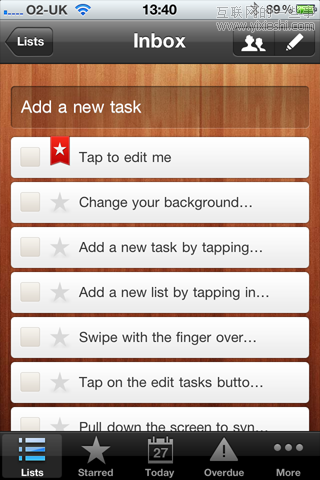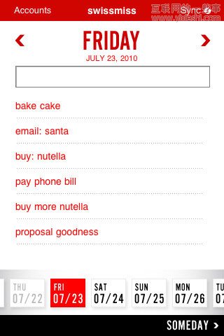 Wunderlist是另外一款任务管理软件,它易于使用和井然有序的界面吸引力许多的设计师。"它使我把自己弄得井井有条。"Flash游戏开发者Iain Lobb说道,"我可以为每一个项目弄一个单独的列表,把待做的事情排序,把真正重要的事情做上标记,这意味着我会优先完成最重要的事情。"设计师和用户体验专家D Keith Robinson也是Wunderlist的支持者,他说:"这是移动设备上的一个非常棒的服务,它就像我的后备大脑一样使我保持有序的状态。"