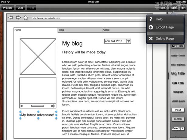 也许iPad最大的好处是它焦点集中:"当某个应用正在运行的时候该设备就好像只在运行这个应用一样"。这意味着你可以心无旁骛的高效快速地完成当前任务。用户体验设计师Aral Balkan认为iMockups"在创建低保真度的线框方面表现出色"。这个界面具有简单的多点触控和拖放功能,这可以让你专注于功能的实现而不是外观。文档可以按照本身的样子通过邮件发送,或者导出为PNG和BMML格式的图片。